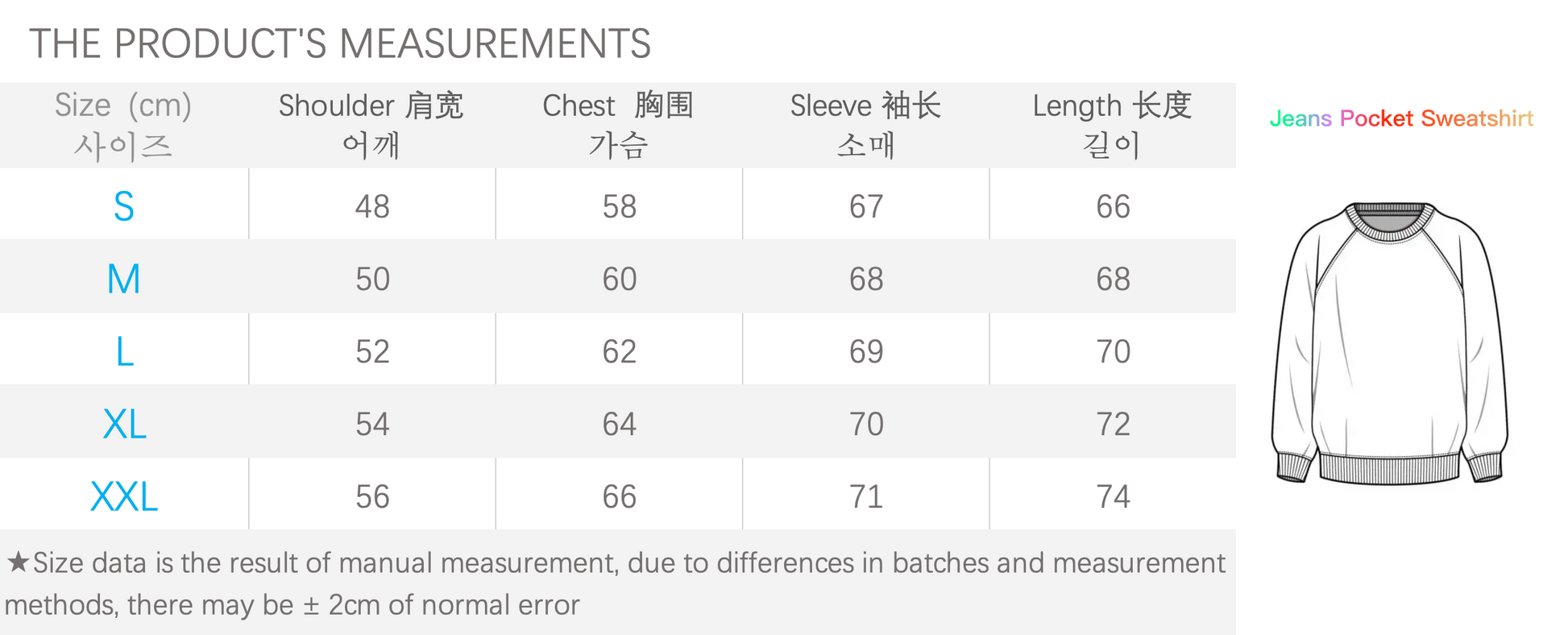 衣长/옷기장 , 胸围 /가슴둘레 , 肩宽/어깨넓이 , 袖口,袖宽/소매넓이 , 腰围/허리둘레 , 裤长/바지길이 , 裙长/치마길이 , 臀围/엉덩이둘레 , 大腿围/허벅지둘레 , 小腿围/종아리둘레 , 脚口/발목둘레 , 体重/몸무게