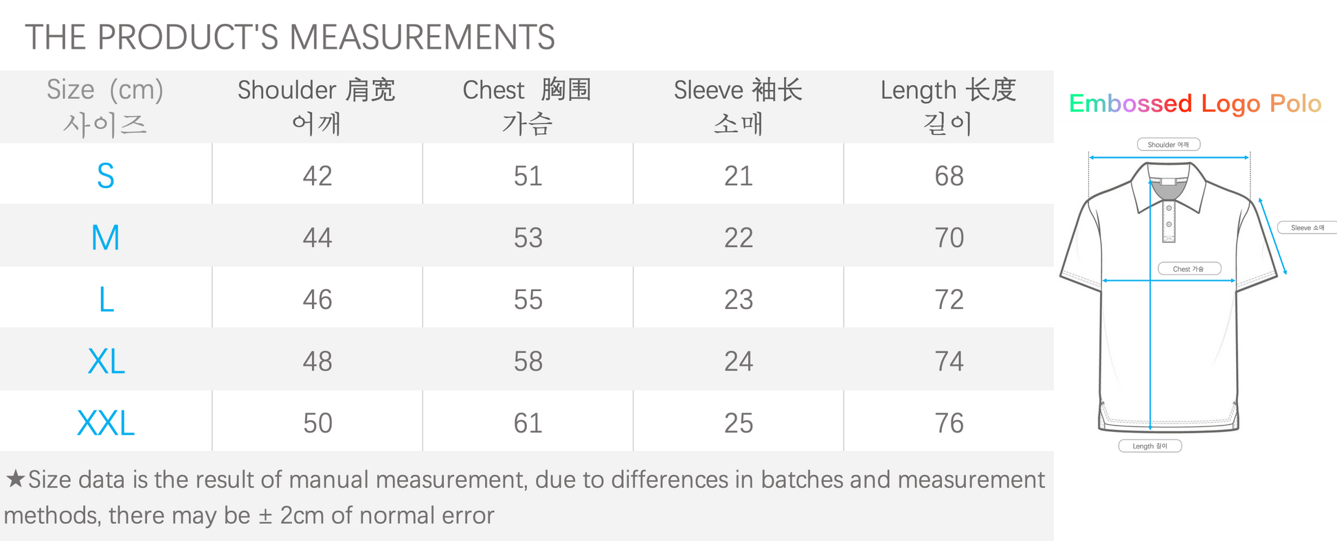 衣长/옷기장 , 胸围 /가슴둘레 , 肩宽/어깨넓이 , 袖口,袖宽/소매넓이 , 腰围/허리둘레 , 裤长/바지길이 , 裙长/치마길이 , 臀围/엉덩이둘레 , 大腿围/허벅지둘레 , 小腿围/종아리둘레 , 脚口/발목둘레 , 体重/몸무게